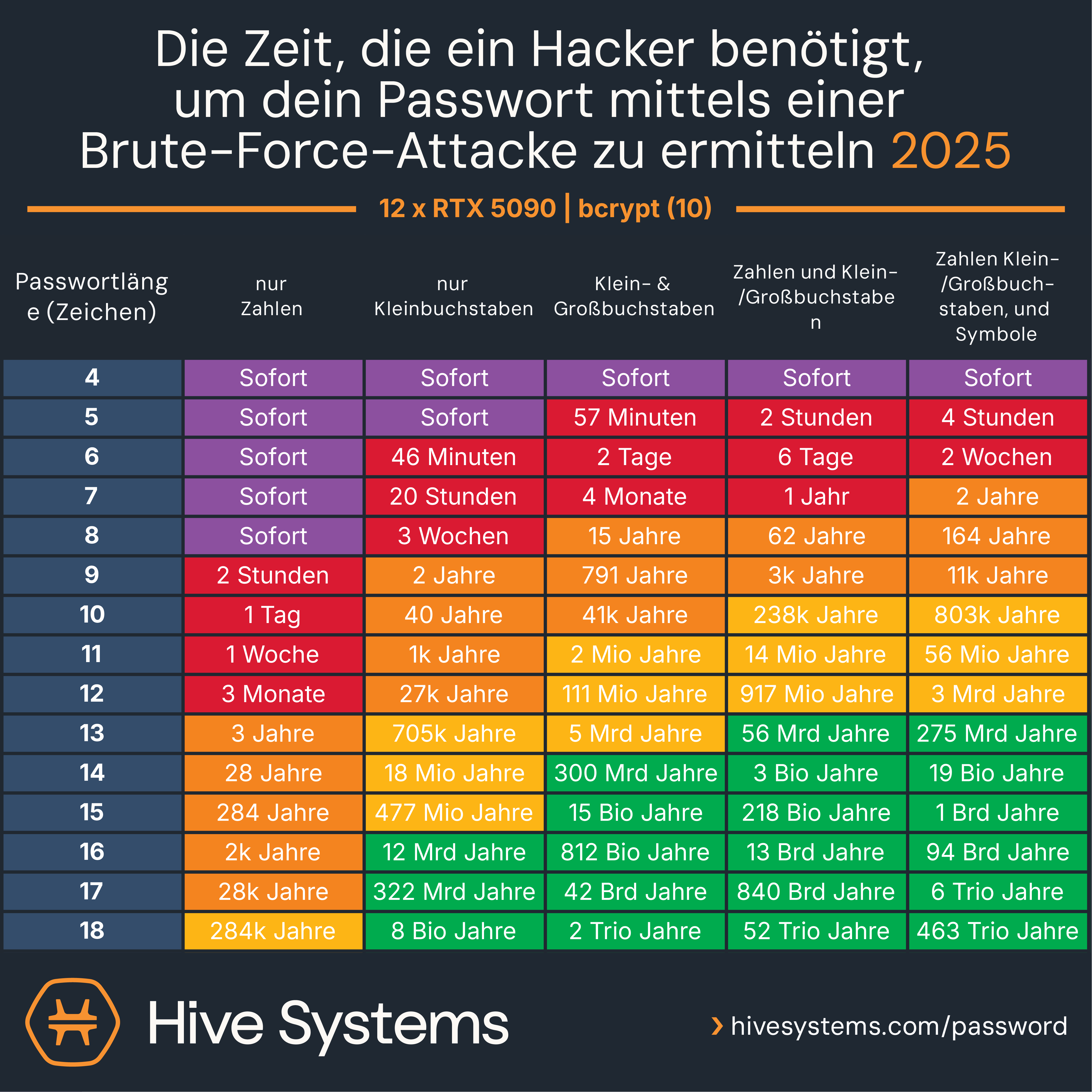So schnell können übringens (Stand 2025) Passwörter geknackt werden: